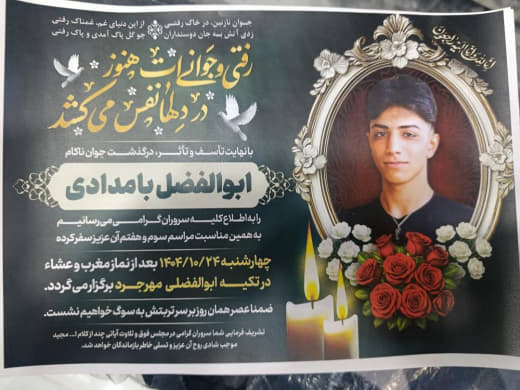ابوالفضل بامدادی، نوجوان ۱۵ ساله عصر پنجشنبه ۱۸ دی در میبد یزد، مقابل ساختمان قرارگاه امامعلی سپاه در این شهر هدف گلوله جنگی ماموران قرار گرفت و جان باخت.