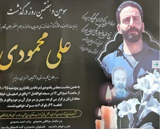 علی محمودی ۳۳ سال داشت، مجرد و شغلش فروش آهنآلات بود که در اعتراضات پنجشنبه ۱۸دی، در منطقه «زینبیه» اصفهان به قتل رسید. سرکوبگران جمهوری اسلامی قلب او را هدف شلیک قرار دادند.