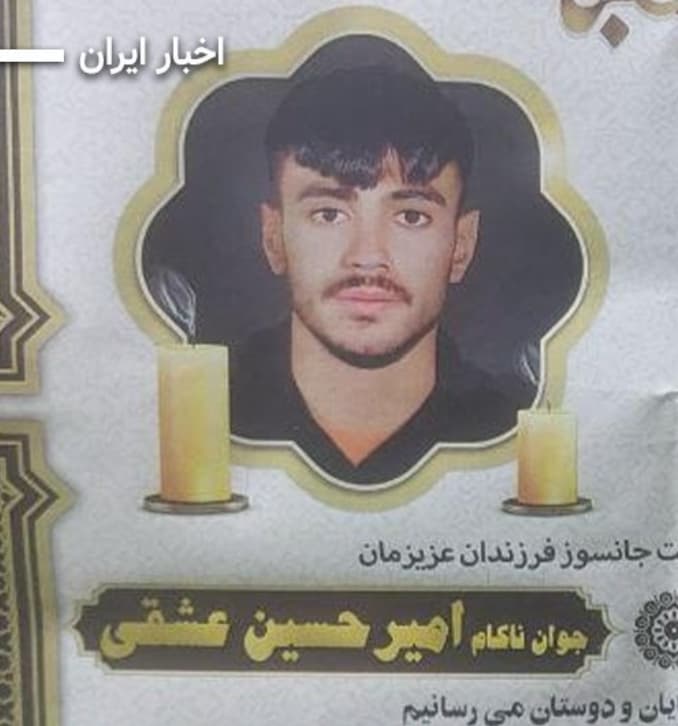 امیرحسین عشقی (۱۸ ساله) پنجشنبه ۱۸ دی نزدیک کلانتری یافتآباد از پشت بام مورد اصابت گلوله قرار گرفت. برادر او، آرین (۱۴ ساله) وقتی صدای تیراندازی را شنید نگران برادرش شد، از خانه بیرون رفت و او هم کشته شد. آنها در یک مزار ۲ طبقه کنار هم به خاک شدند.
