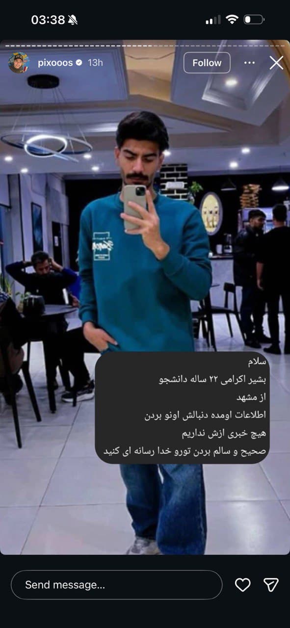 بشير اكرامى ٢٢ ساله دانشجو از مشهد. اطلاعات اومده دنبالش اونو بردن هيج خبرى ازش نداريم.