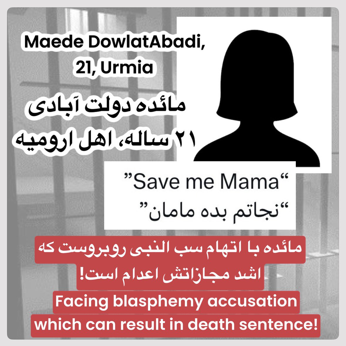 مائده دولت آبادی در تماس کوتاهی با مادرش گفت: «نجاتم بده مامان» مائده دولت آبادی در دی ماه ۱۴۰۴ در ارومیه بازداشت و اکنون با اتهام سب النبی روبروست. اشد مجازات سب النبی اعدام است!