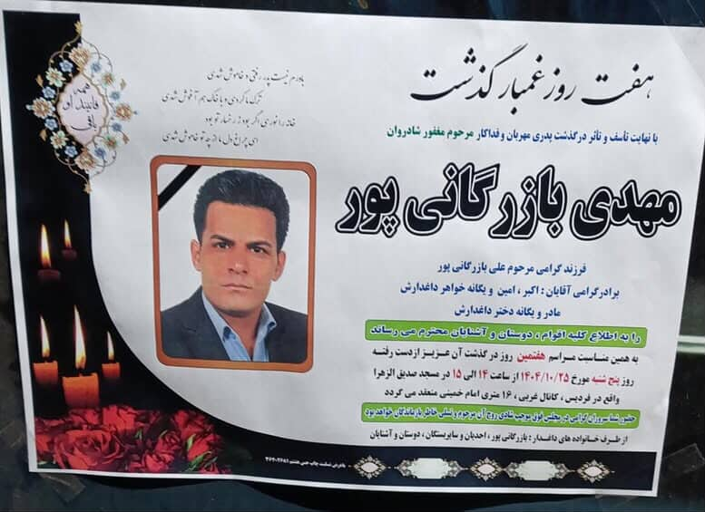 مهدی بازرگانیپور، ۴۶ ساله، صاحب مغازه لوازم جانبی موبایل، ساکن فردیس کرج، ۱۹ دی ۱۴۰۴ در جریان اعتراضات مردم ۹ با شلیک مستقیم نیروهای سرکوبگر حکومت به قلبش کشته شد.
